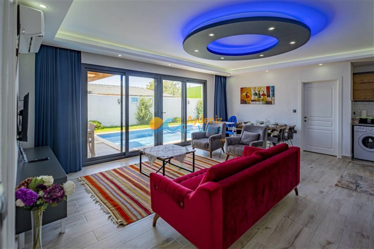 Salonumuzda rahat, kaliteli, oturma gurubu, LCD ve uydu alıcısı, havuz başına ve bahçeye çıkış vardır.